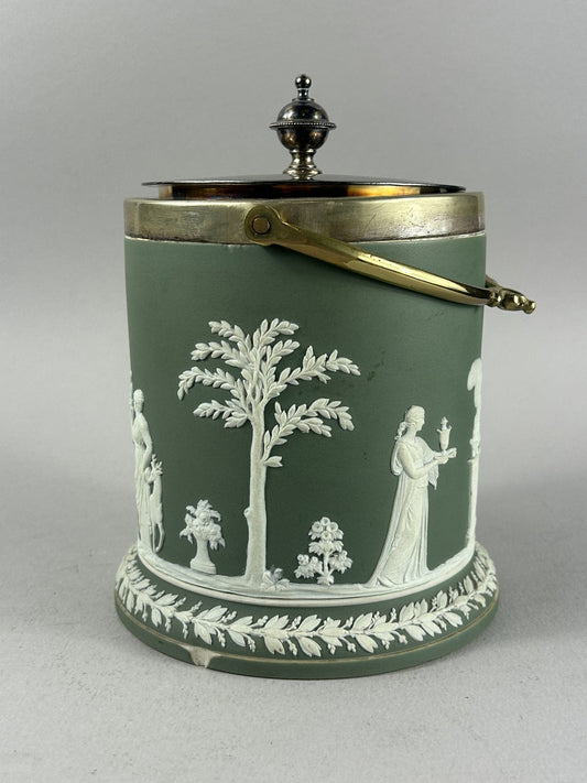 Antique Wedgwood Green Jasperware Biscuit Barrel with Metal Mounts