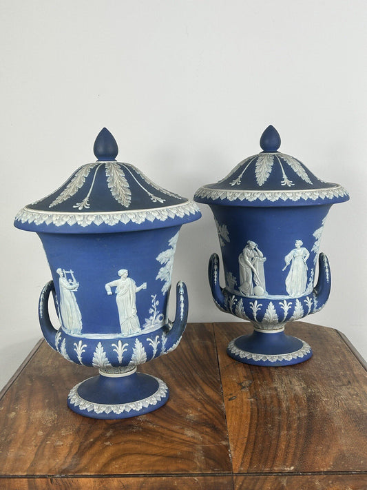 Wedgwood Dark Blue Jasperware Twin Handled Urns & Covers 19th Century